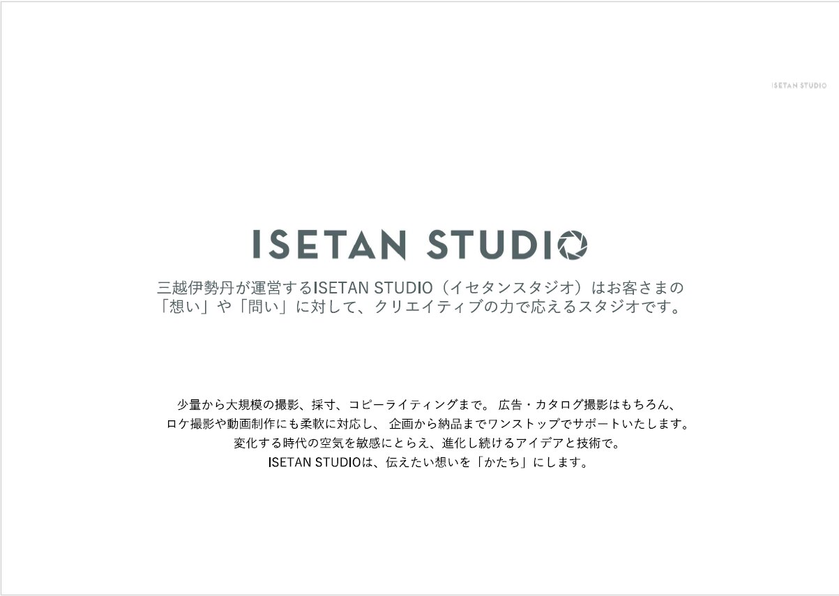こんな方におすすめ ・三越伊勢丹グループのISETAN STUDIOサービス概要を知りたい ・自社HPやECサイト向けのイメージ撮影/映像制作を考えている