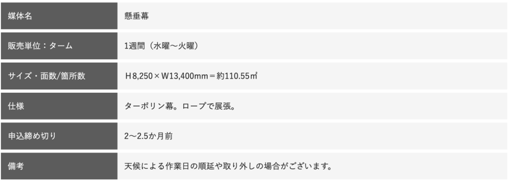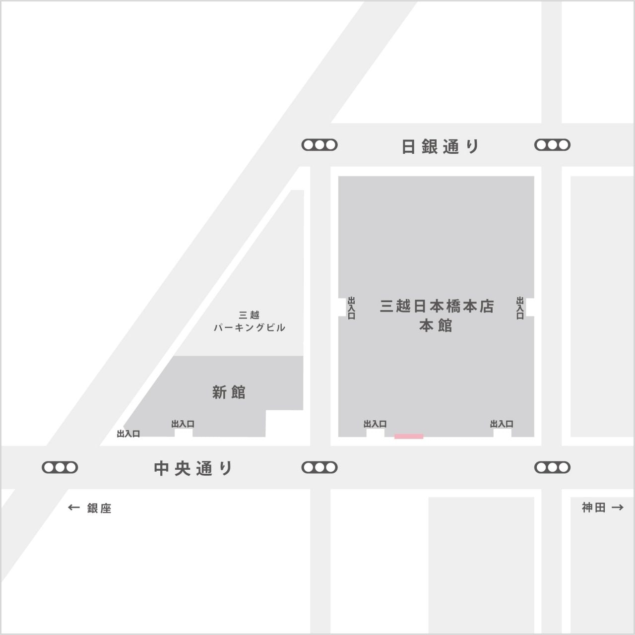 日本橋三越本館の中央通りの壁面に位置する大型懸垂幕です。ビッグビジュアルのインパクトで注目を集めます。