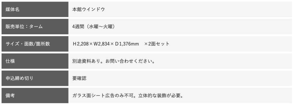 日本橋のメインストリートである中央通りに位置する日本橋三越本館の顔とも言える大型ウインドウです。通行者だけでなく車輛に対してもアピール可能です。
