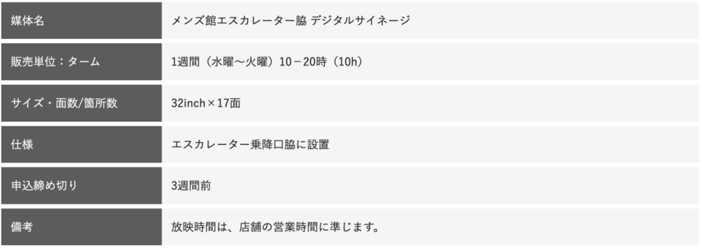 メンズ館のフロア移動の主要動線であるエスカレーター脇のサイネージです。各階のフロア情報等を発信をするサイネージの上部に全17か所設置されています。メンズ館のメインサイネージです。