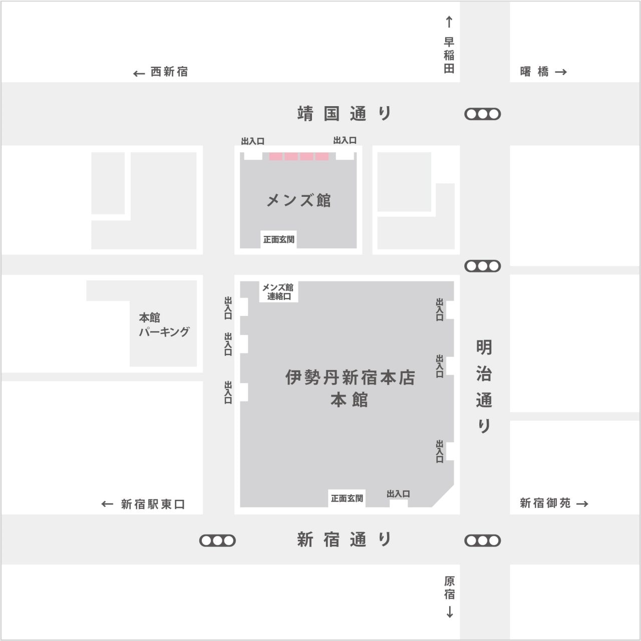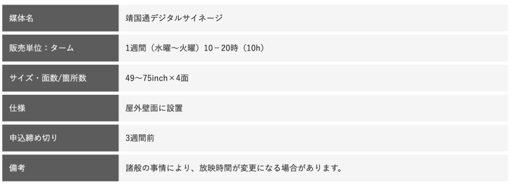 メンズ館1階の靖国通り沿いに設置された4面のサイネージです。49~75inchの大型モニターで、靖国通りの通行人にアピールします。