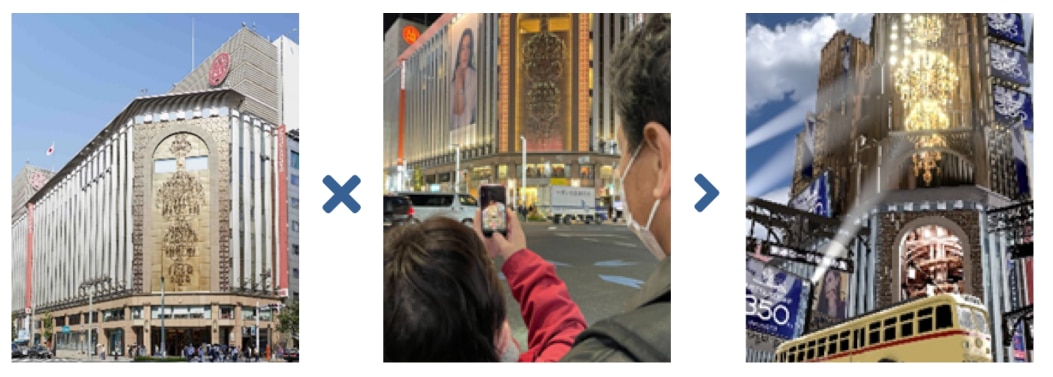 三越銀座店の銀座シャンデリアをスマートフォンにインストールした ARアプリ「XR CHANNEL」 を通して見ることで拡張現実上でコンテンツが配信されるという最先端のデジタルOOHです。